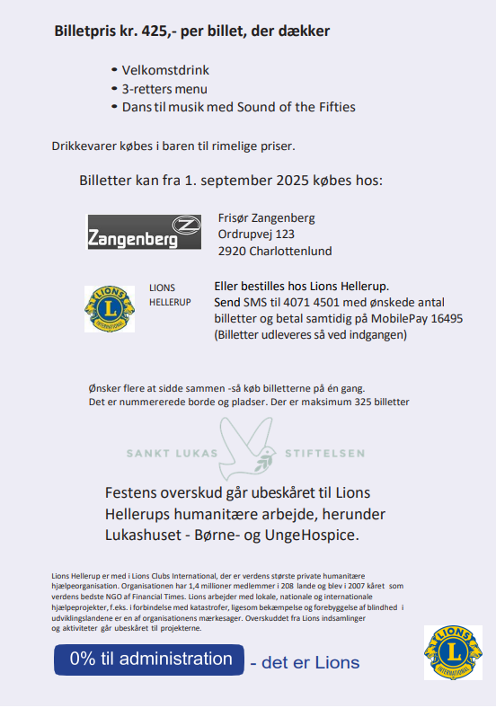 Lions Hellerup glæder sig igen til at se de mange gæster, der nyder godt af dette arrangement. Billetprisen dækker en velkomstdrink og en 3-retters menu inden der trædes ud på dansegulvet. Hele overskuddet fra denne aften går til Lions humanitære og almennyttige arbejde, som blandt andet omfatter støtte til Lukahuset – Børne og Ungehospice på Sankt Lukas Stiftelsen. | | | |